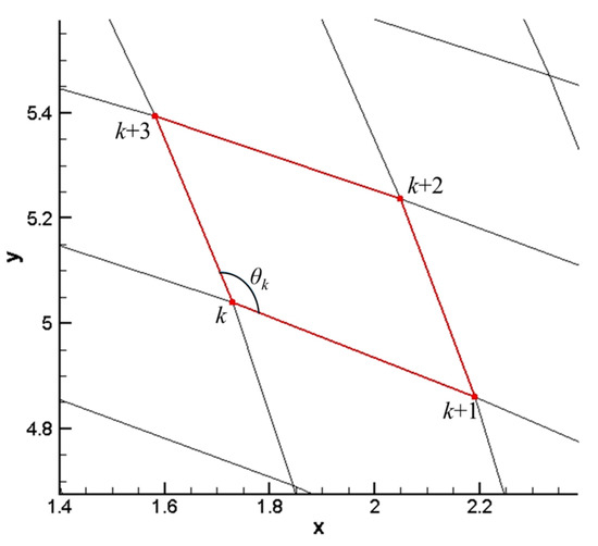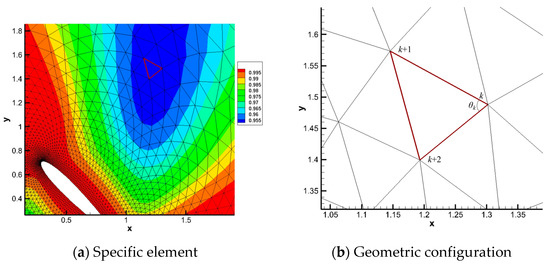 In order to check the accuracy of mapping-based metrics of mesh deformation, a specific element with the minimal metrics value in the blue area is selected as Figure 11a shows with a red line. Same as described in Section 4.1, with the geometrical method, the angles of deformed mesh and the area ratio from initial mesh to deformed mesh can be calculated directly based on geometrical relationships. The geometric configuration of the specific element is presented in Figure 11b. is the angle between the sides joined at the th node in the element.