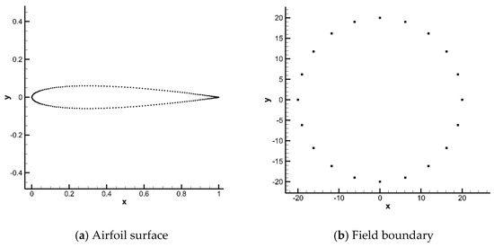 This test case considers the mesh movement due to a severe rotation of airfoil NACA0012. The airfoil is initially located in the center of a circle domain with a radius of , with being the chord length of the airfoil. The trailing edge of the airfoil is initially at point and the leading edge at point . The initial mesh is triangular and given in Figure 7. Two hundred nodes on the airfoil surface and 20 nodes on the filed boundary are selected as control points to calculate RBFs’ interpolation. Control points on the airfoil surface and field boundary are presented in Figure 8.