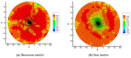 Figure 12 and Figure 13 show the calculation results of traditional mesh-based metric described in Section 3.2 and Section 3.3 in this test case. For this unstructured mesh, all the elements are triangles. The skewness metric is used to measure the distortion, which contains both element angles and length ratios [35]. The mesh-based metric distribution is different from that of mapping-based metrics. Every two sides of any initial element are not parallel to the base vectors of initial configuration on which the mapping-based metric of deformation is based. Therefore, the comparison between mapping-based metrics and mesh-based metrics is useless.