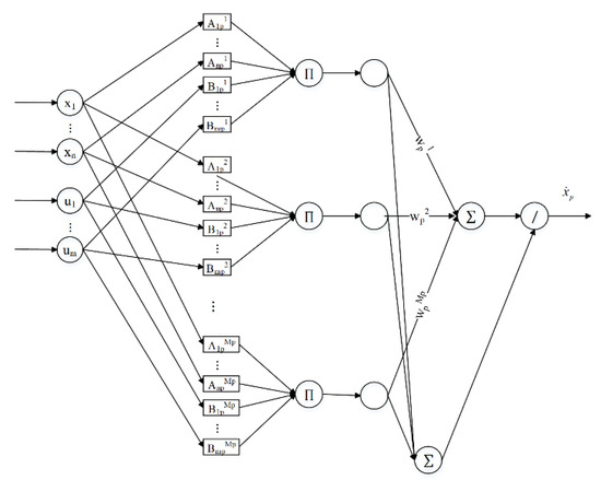 First, from the input-output data, a set of multi-input-single-output FBFNs with product fuzzy inference, Gaussian membership functions (MFs), and centroid defuzzifier are trained by the least square algorithm [22] to approximate the nonlinear system whose analytical mathematical model is not available. Each FBFN can be represented as a fuzzy system in layered network form (see Figure 1), and is used to approximate the dynamics of one state variable. For example, the FBFN for the p-th state variable is constructed using fuzzy rules as: