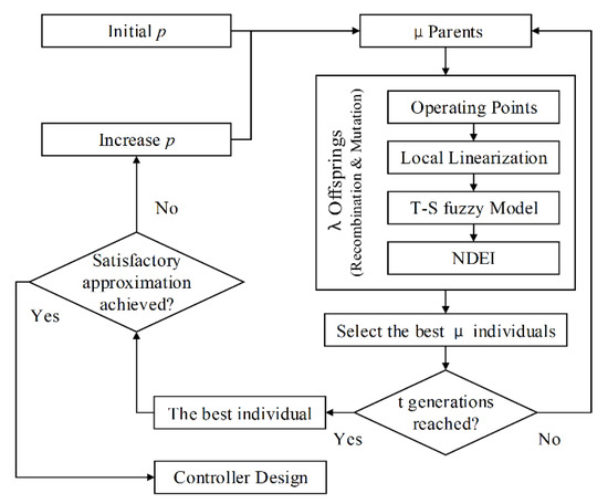 The ES optimization is controlled by three parameters: the maximum number of generations t, the parent population µ, and the offspring population λ. The optimization starts with initializing a parent pool with µ individuals. Then, in each generation, a pair of parents is randomly selected to produce an offspring via recombination and mutation, as explained in [24], until λ offspring have been generated. Each offspring is used to build a T-S model at the operating point associated with it and the NDEI of this model is recorded. The best µ offspring will form the parent pool for the next generation. If the optimized set of operating points after t generations doesn’t yield a T-S fuzzy model with satisfactory global approximation, the number of operating points p will be increased, and the optimization will be repeated, as illustrated in Figure 2.