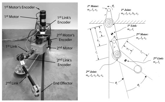 Flexible robot manipulators possess various advantages over the rigid ones: they require less material, allow higher manipulation speed while consume less power, and are safer to operate due to reduced inertia. However, controlling flexible robot manipulators for precise positioning could a challenging task because of the high precision required for positioning, oscillation due to flexibility, highly nonlinear and distributed dynamics of the system, as well as the difficulty in establishing an accurate model [29]. The picture and the schematic of the two-link flexible-joint robot manipulator to be dealt with in this paper are shown in Figure 3.