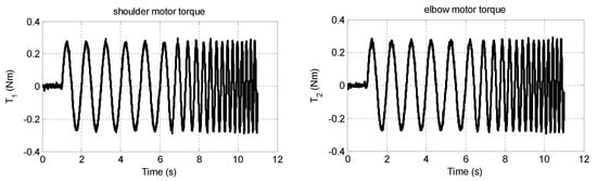 To obtain the neuro-fuzzy model of the robot, the motors were excited by sine sweep torques. A combination of a 5-s 1 Hz sine wave and a subsequent 5-s sine sweep signal with an initial frequency of 1 Hz and a final frequency of 5 Hz was used to excite the shoulder motor and elbow motor, as shown in Figure 4. Then, 2000 training data are evenly drawn from the collected input-output pairs and used to train the neuro-fuzzy model. 500 testing data that are different from the training data are used to test the accuracy of the neuro-fuzzy model and the subsequent T-S fuzzy models. The T-S fuzzy models in this paper are all constructed with triangular membership functions due to their simplicity.