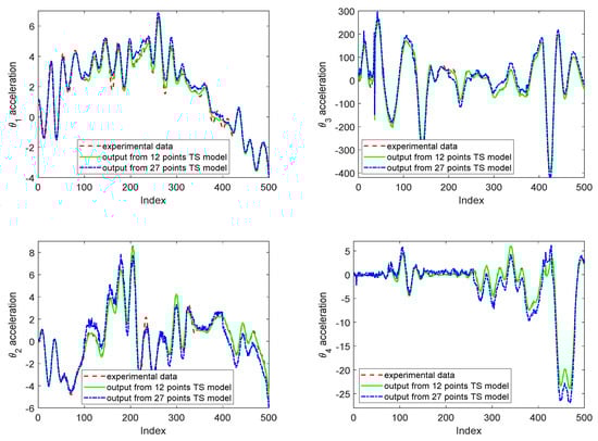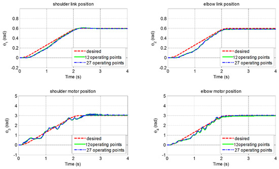 Two sets of operating points are selected for comparison: the first set consists of 27 points based on the combination of uniformly chosen positions θ2 = [−0.7, 0, 0.7] (rad), = [−1.0, 0, 1.0] (rad/s) and = [−1.0, 0, 1.0] (rad/s); the second set consists of only 12 points, the positions are chosen by the ES optimization: θ2 = [−0.9575, −0.0181, 0.9479] (rad), = [−0.9034, 0.5891] (rad/s) and = [−1.5, 1.5] (rad/s). θ2 is assigned three positions while the other two are assigned only two positions as θ2 is the most significant source of nonlinearity according to Table 2.