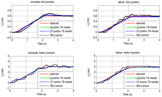 where e1 and e2 are tracking error of θ1 and θ2. The PID gains were based on [32], in which a PID controller was designed for this robot manipulator. Figure 6 shows the simulated responses of the flexible robot system with the fuzzy controllers and PID controller, while the mean square errors (MSEs) of command tracking are compared in Table 4. The performances of the fuzzy controllers are evidently better than that of the PID controller. The PID responses exhibit larger overshoot and longer settling time, which leads to larger MSE. The results of the 12 points T-S fuzzy model are almost the same as the results of the 27 points one, as the non-significant difference of modeling errors may only yield trivial effect on the control system. Since the number of linearization is reduced, the 12 points T-S fuzzy model is more computationally efficient.
