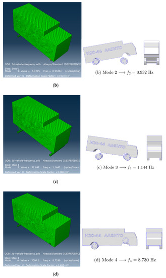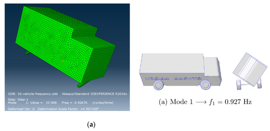 The rotatory inertias are attached to the reference point of the body part. However, the axle parts could not simply attach the mass and rotatory inertia on the reference point since this will make the axle only have vertical displacement but no rotation. In solving this issue, the axle mass is divided into four-point masses, and the locations can be calculated to meet the given rotatory inertia. Through these implementations, the ABAQUS truck model’s frequency analysis results are quite the same as those by Oliva et al. [25]. Comparing these frequencies in Oliva et al. [25], the current results are shown in Figure 12.