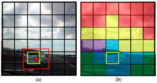 You only look once (YOLO) [10] is a machine learning (ML) framework for object detection, which attempts to detect any object depending on what is used to train the detection model. YOLO object detection can detect the location and the class of the object in the input image by carrying out one calculation of convolutional neural networks. In the first place, the input images are divided into S × S squares, which are called grid cells. As shown in Figure 2, there are 6 × 6 grid cells in Figure 2. Secondly, the prediction of the bounding box must be applied after the grid cells in the image are obtained. Each grid cell must process a fixed amount of prediction of the bounding box and confidence score. There are five values in each bounding box, including x, y, w, h, and confidence. The x, y value is the center of the bounding box, and w and h are the width and height, respectively, of the bounding box. The confidence is the value of intersection over union (IOU). The confidence score represents the probability of the bounding box that may contain the object. The confidence score will be zero if the bounding box does not contain an object. After predicting the bounding box, it will abandon redundant bounding boxes by the threshold method and the non-maximum suppression (NMS) method. The above operation is the method used to detect the location of the object in the image. Lastly, the class of the bounding box must be predicted. In this process, the class probability map must be used (Figure 3).