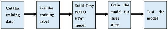 In this section, we discuss our training data, our car object detection model structure, and the training of the model. Our methods are demonstrated in the following sections. A flow-chart of object detection of the car is shown in Figure 7. The images from the car camera were used as our training data, and we applied labelImg [19] to obtain the training labels in the form of xml files. In addition, we built the object detection model of cars and trained the model in three steps. Finally, we used road images and videos to validate and evaluate the model.