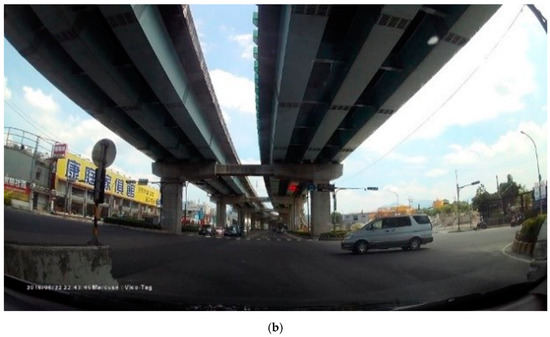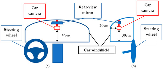 The view of the camera placed inside the vehicle is shown in Figure 9. Image (a) is the front view of the position of the camera inside the car, which was about 30 cm away from the steering wheel. The red rectangle is the car camera and the trapezoid above the car camera is the rear-view mirror. Image (b) is the side view of the position of the car camera inside the car, which is about 30 cm away from the steering wheel and 20 cm away from the car windshield.