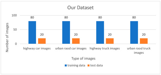 There were 400 road images in our data set, of which 320 images were training data and 80 images were test data. These images were collected from the car camera in the car when driving on the urban road and highway. There were four types of images in our data set, as shown in Figure 10. The blue bar is the training data while the orange one is the test data.