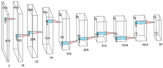 We used Darkflow [18], which is the github open source code. It is written in the Python background and designed as the YOLO version two. We applied a simpler version of the YOLOv2 model structure called Tiny YOLO VOC, which is a kind of object detection model, and we did not change any of the model’s parameters [18]. Figure 11 shows the structure of the Tiny YOLO VOC model and the essential parameters of Tiny YOLO VOC are shown in Table 1. The white rectangles are the layers, and the blue rectangles and red triangles are the sign of convolution process.