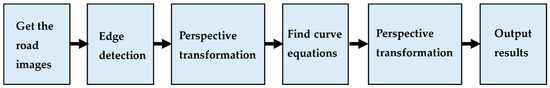 The lane line detection system can detect the lane line area on the road, assisting the drivers to drive in the appropriate lane. In this part, we discuss the process of lane line detection. The flow-charts of lane line detection are shown in Figure 12. When the road images were input, the edge detection was used to obtain the edged image. Next, perspective transformation was applied to convert the 3-D view to the 2-D view, and we could find the curve equations of lane lines. After obtaining the equations, we drew the lane area and performed the perspective transformation again. Finally, we could obtain the lane region and complete lane line detection.