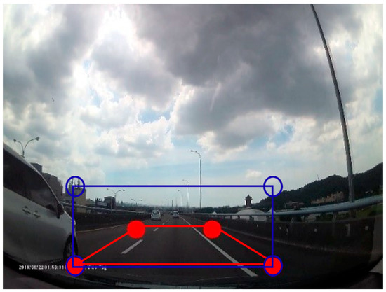Our input images were ground truth images from the car recorder. After image input, we needed to find eight points on it (Figure 13). The red points could generate an area, which covered the two road lines. These eight points were later used in the process of the projection transformation.