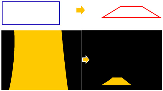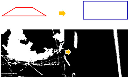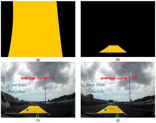 In order to obtain clear road lines, edge detection was carried out on our input road images. We used the projection transform to obtain the edged road images. This was the most significant step in the lane line detection. The main purpose of it was to convert the perspective from the 3-D view to the 2-D view, as seen in Figure 14. We conducted projection transformation twice in the lane line detection. Furthermore, the images of the projection transformation were used to find the curve equation that fit the two road lines. After obtaining the curve equations, we plotted our lane area. Since we processed the projection transformation, we had to convert the lane area from the 2-D view back to the 3-D view. Figure 15 shows the projection transformation of the lane area. In the end, we could combine the lane area with the original road image. The above is the entire process of lane line detection.