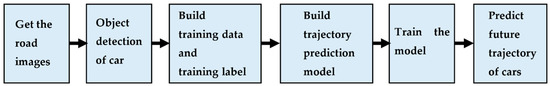 This section is the substantive content of our research. We sequentially discuss our data set, our car trajectory prediction model structure, and the training of the model. Our process is shown in the following sections. A flow-chart of the trajectory prediction of a car is shown in Figure 16. After the road images were input, object detection of the car was applied to obtain the X and Y coordinates of the car in the images. In addition, we built training data, which contained X and Y coordinates of the car and the training label, containing only the X or Y coordinates of the car. Next, we built and trained a trajectory prediction model based on LSTM. Finally, we tested and evaluated the model.