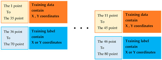 In the training process, we required certain model training data. We used the data set from Section 3.3.1. Next, the training data and train label could be constructed. Our aim was to train the model to predict the future trajectory of the car. Points 1 to 35 were used to predict the next 35 points. Figure 18 shows the method used to obtain the training data and labels.