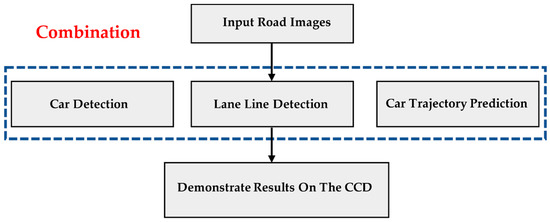 We combined the techniques from Section 3.1, Section 3.2 and Section 3.3. We combined all Python code together. When the road images were input, it could process car detection, lane line detection, and car trajectory prediction simultaneously. As a result of the input of the three techniques was road image so that we could achieve this combination. Figure 19 shows our concept of the combination of techniques.