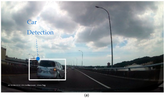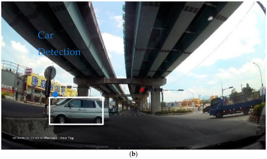 In this section, we show our research results and discuss them. The first is car object detection, the results of which are shown in Figure 20a,b. We find that the model is quite accurate. It has the ability to detect the car precisely. In the first training, it took 5 min and 58 s to train the car detection model. The loss dropped from 106.00877 to 0.96654, and the average loss from 106.00877 to 3.2454. At the second training step, it took 5 min and 57 s to train. The loss and the average loss fell to 0.69618 and 0.83406, respectively. Finally, in terms of the training step, because training was carried out 25 times, it took 15 min and 10 s. Fortunately, the loss and the average loss dropped to 0.22245 and 0.39897, respectively. The training results of car object detection are demonstrated in Table 8, and the evaluation results of the images of the trained car detection model are shown in Table 9. In the evaluation, the accuracy reached 0.89, and it only took 0.132 s to detect the car. Furthermore, the evaluation results of videos of the trained car detection model are shown in Table 10. We used the value of frame per second (FPS) to measure the smooth performance of a video. The larger the number of FPS, the faster the display speed, the higher the frequency, and the smoother the image. The model was detected at 10.995 FPS, with an accuracy of 0.91, which is close to real time detection.