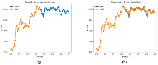 The training of the car trajectory prediction model. We showed the results in four rows: (a) the accuracy of predicting x coordinates model, (b) the loss of predicting x coordinates model, (c) the accuracy of predicting y coordinates model, (d) the loss of predicting y coordinates model; (e,f) compare the real x coordinates and predicted x coordinates. The blue line is x coordinates predicted by our model, and the orange line is the real x coordinates; (g,h) compare the real y coordinates and predicted y coordinates. The blue line is y coordinates predicted by our model, and the orange line is the real y coordinates.