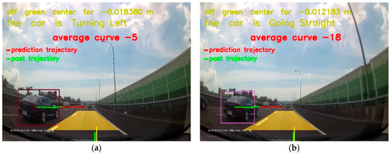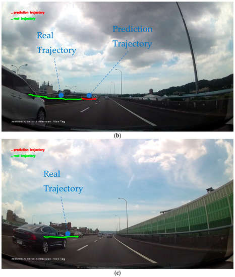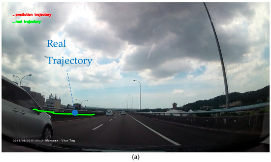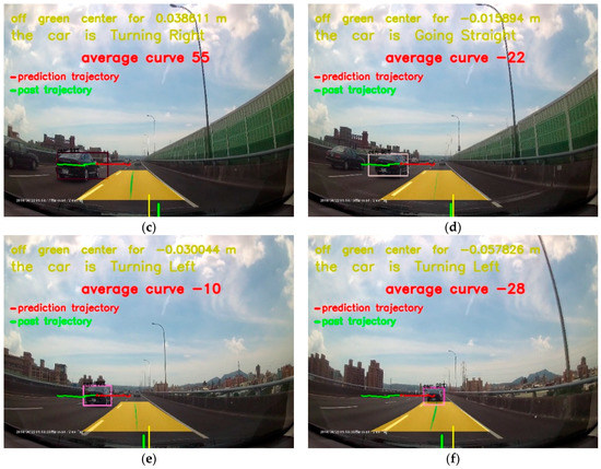 At last, we showed the results of the combination of all techniques. Figure 24 shows the first results of the validation. All the images in Figure 24 show the three techniques, namely car object detection, lane line detection, and car trajectory prediction. The images (a), (b), and (f) in Figure 24 show excellent results. However, as seen in images (c), (d), and (e) in Figure 24, while the car detection and car trajectory prediction performed quite well, unfortunately, we found that the lane area in these three pictures was slightly wrong due to other vehicles blocking our lane line. In image (d), the car on our left side crossed the lane so as to block the lane line. It caused the process of lane line detection to obtain the wrong curve equation. That is to say, the detection of the lane area was wrong. We considered that to be reasonable. If other vehicles were to cross the lane, we definitely would not be able to see the lane line as well due to the lane line being blocked by others.