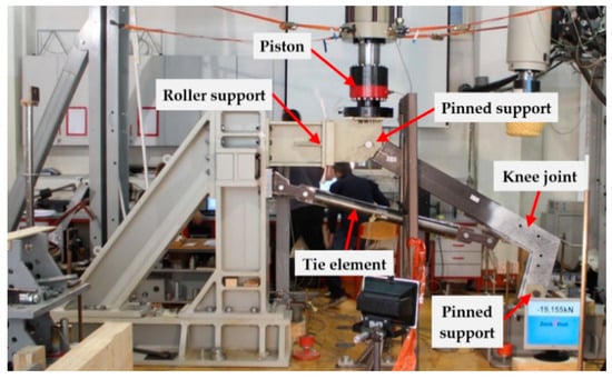 Laboratory testing was conducted at the Faculty of Civil Engineering, University of Zagreb. Three identical steel knee joints (marked with S1–S3) were tested under static loading to induce bending in the specimens. At both ends, specimens were supported with pin connection to allow free rotation around one horizontal axis while restraining translation in all directions (Figure 1). However, translation in the vertical direction was allowed at the free end of the beam element using roller type support to enable the introduction of the load. At the initial position, the angle between the tie element and the beam was 15°, which corresponds with the geometry of realistic prefabricated aluminium halls.