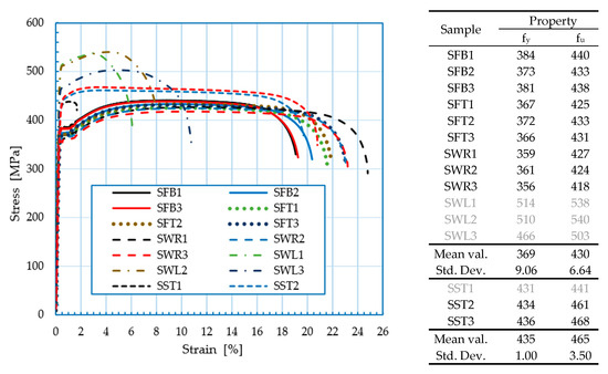 The mechanical properties of RHS 180 × 80 × 3 were characterised by stress-strain curves taken from 12 coupons (Figure 4). Deviation of the results for the curves SWL1–SWL3 can be noted. Those coupons showed higher yield and ultimate strength but brittle behaviour as well. Such results are expected, since coupons for SWL were taken from the welded part of the cross section. Hence, those results were not taken into consideration when calculating mean values of mechanical properties for the RHS 180 × 80 × 3 for the purpose of numerical study. The mean value of yield strength (fy) was 369 MPa, with a standard deviation of 9.06 MPa. The mean value of ultimate tensile strength (fu) was 430 MPa, with a standard deviation of 6.64 MPa. It can be noted that values of fu of 9 tested samples show lower scatter compared to values of fy (6.64 < 9.06).