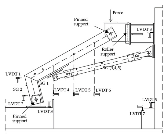 Displacements of the specimens were measured using linear variable differential transformer (LVDT) sensors, while deformations were measured using strain gauges (SG) [21]. For each sample, nine LVDT sensors were used (LVDT1 to LVDT9) and five strain gauges (SG1 to SG5) (Figure 6). Rotation of the column was measured using LVDT 1 and LVDT 2, while the horizontal displacement of the column base was measured using LVDT 3. Vertical displacements of the beam were measured with LVDT 4–LVDT 6. Displacements of the supporting structure measured using LVDT 7–LVDT 9 were smaller than 1 mm, leading to the conclusion that no significant rotation of the supporting structure occurred during all tests.
