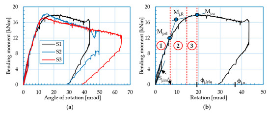 Moment–rotation curves: (a) rotational behaviour of specimen S1–S3; (b) main properties of the Mj–ϕj curves.
