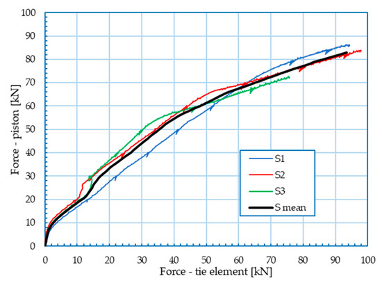 Strain in the tie element was recorded by three strain gauges (SG 3–SG 5) in the middle cross section of the tie element in all 3 specimens (S1–S3). Using the calculated mean strain value of the tie element, tensile force in the tie element was calculated for each specimen, and subsequently, the relationships of the load at the piston and the force in the tie element was obtained (see Figure 11). The mean value of tensile force in the tie element for specimens S1–S3 was also calculated. After reaching a force at the piston of approx. 72 kN, specimen S3 failed. Due to the premature failure of specimen S3, tensile force in the tie element for that specimen had to be extrapolated so that average value could be calculated for the entire range (black curve).