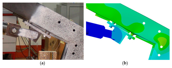 Boundary conditions in the numerical model were defined to represent those of the laboratory test as accurately as possible. At both ends, the steel specimen was free to rotate around the horizontal axis while translations at both ends were restricted in all directions except for vertical displacement at the free end of the beam to allow the introduction of the load in the specimen in the form of a 30 mm vertical displacement. It must be noted that 2 mm displacement of the supporting structure in the horizontal direction occurred during the loading phase, which corresponds to approx. 2 mm displacement in the vertical direction at the piston. That was included in the numerical results as 2 mm translation of the numerically obtained force–piston displacement curve (Figure 13a). All the boundary conditions in the model were assigned on the perimeter of the pin hole.