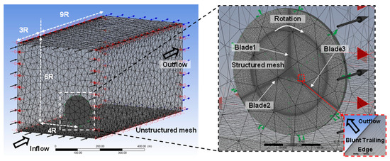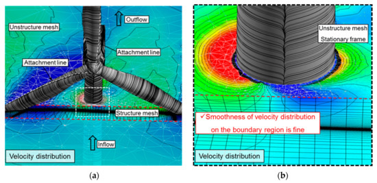 Considering the relative motions between the rotating frame and the stationary frame, a sliding mesh method was applied to the present analysis [23]. As shown in Figure 2b, the velocity distribution of the sliding mesh boundary region was smoothly formed by the sliding mesh technique. Structured H-type grids were adopted in the rotating frame in order to evaluate the aerodynamic performance of the wind turbine with high accuracy. The computational grids of a blade passage in the rotating frame consist of 115 cells in the streamwise direction, 140 cells in the spanwise direction, and 148 cells in the tangential direction. However, the stationary frame area excluding the rotor blade was too large to apply the structure grids. Due to this reason, the computational grids of the stationary frame are composed of 3.04 × 106 un-structured tetrahedral cells, and the total number of whole computational grid systems is approximately 1.028 × 107 cells [24].