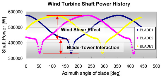 The aerodynamic performance (shaft power) history of a WTG on each rotating blade with the various azimuth angles is shown in Figure 7.