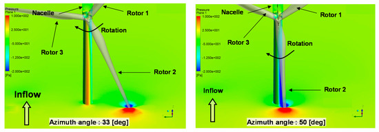 Two different aerodynamic fluctuations with 3P frequency are distinctively observed. The first phenomenon is the wind shear effect determined by Equation (1) in Section 2.2. In the case of 0° azimuth angle, the aerodynamic performance of the rotor 1 is approximately 18.7~31.9% higher than that of the rotor 2 and 3, while the performance rapidly decreased at the 45° azimuth angle. The second phenomenon is the blade-tower interaction, which leads to high pressure drop as blades pass close to tower as shown in Figure 7, which showed additional 22.1% drop of shaft power when the blade 2 passed tower very closely (50° azimuth angle). Figure 8 shows the visualization of the pressure distribution at two different azimuth angles, 33° and 50°.