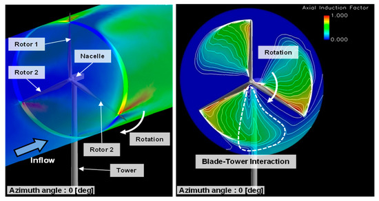 When the axial induction factor becomes 1/3, the aerodynamic performance coefficient has maximum value with 0.593. As shown in Figure 9, the axial induction factor of the rotor blade passage between the rotor 2 and the rotor 3 around the tower is remarkably high, compared with other rotor blade passages. Based on Equation (3), the above phenomenon influences the aerodynamic characteristics of the wind turbine rotor blade.