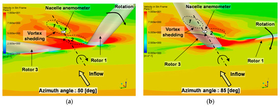 Instantaneous velocity distribution and unsteady behavior of the vortex structures around the nacelle anemometer at 50° and 85° azimuth angle are shown in Figure 10. The vortices around the rotor hub are shed in synchronization with 3P frequency due to a large blockage effect of the stationary tower. The vortex shedding 1 has a significant effect on the flow field around the nacelle anemometer at 50° azimuth angle. At the 85° azimuth angle, the vortex shedding 1 is diffused as moving in the downstream direction, and then the vortex shedding 2 has a major effect on the nacelle anemometer flow field. Above that, the periodic vortex shedding phenomena dominate the complicated and vortical flow field around the nacelle anemometer and wind vanes.