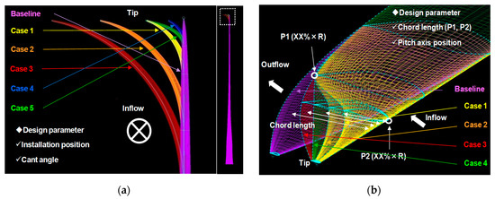 As shown in Figure 12a, several design parameters such as the spanwise installation position, cant angle, taper ratio, and sweep angle should be considered to design the winglet tip shape. However, the winglet tip shape design of the present study was carried out using only two design parameters of the installation position and cant angle. The determinants of the ogee tip shape are the spanwise chord length and pitch axis position distribution as shown in Figure 12b.