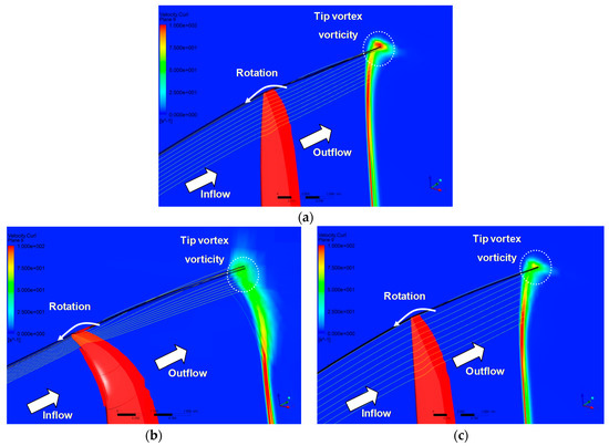Three-dimensional vorticity distribution according to various rotor blade tip. (a) Original tip design (base), (b) optimized winglet tip design, (c) optimized ogee tip design.