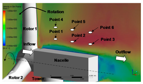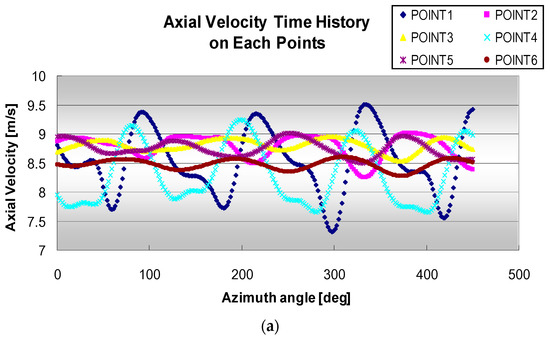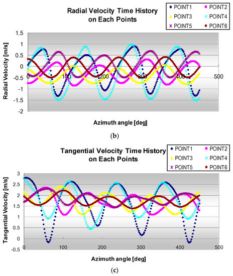 Additionally, velocity time history at suggested six points are computed as shown in Figure 15 according to the varying azimuth angle. The periodic fluctuation apparently indicates the effect of interaction of rotating blades with a hub and nacelle. The velocity components (, , ) in the polar coordinate were transformed from the Cartesian velocity components (, , ) as follow.