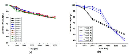 To investigate the long-term reliability of OLED light panels and luminaires, we have measured the maintained lumen output characteristics. Maintained lumen output of OLED panels and luminaires after six thousand hours to their initial value is shown in Figure 2a,b, respectively. All OLED panels show about 80% of lumen maintenance and similar degradation characteristics even at six thousand hours of operation. In case of OLED luminaires Type E and F, lumen output degrades more steeply even at two thousand hours compared to OLED panels (type A, B, C, and D). This is because, in case of OLED luminaires, lumen degradation effect got worse by the effect of the control gear which is integrated in the luminaires and the overall luminaire design including thermal management. Moreover, the difference in the degradation pattern of OLED luminaires from one thousand hour to four thousand hour came from each unique design by the different luminaire manufactures.