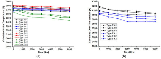 Figure 3. Characteristics of maintained correlated color temperature (CCT) of OLED products. (a) Maintained CCT of OLED panels. (b) Maintained CCT of OLED luminaires.