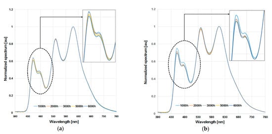 Figure 4. Normalized spectrum variation with operating time. (a) OLED panel type A (b) OLED luminaire type E.