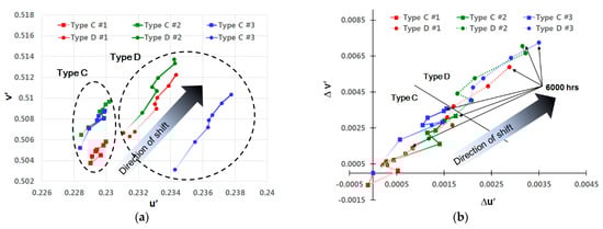 To analyze the effect of panel size on the color quality, variation in CIE 1976 color coordinates of OLED panel type C (200 mm × 50 mm) and OLED panel type D (320 mm × 110 mm) were evaluated. Measured u’ and v’ variation of OLED panel type C and D have similar tendency with operating time up to six thousand hours shown in Figure 5a. Amount and direction of u’ and v’ shifts in each type of OLED panel are almost same even with different initial u’ and v’ points. Such characteristics are more clearly identified by Δu’ and Δv’ values as shown in Figure 5b. Because of the decrease in the blue spectrum, main direction of this shift heads for yellow-red direction [20,21]. Amount of maximum shift in OLED panel type D compared to that of OLED panel type C is over 2.4 times in Δu’ and 2.0 times in Δv’, respectively. Thus, in case of OLED panel which has large surface area needs more careful design in the applications to maintain color quality.