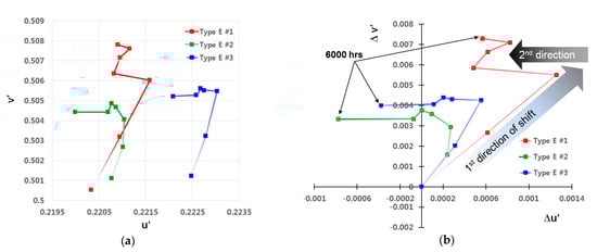 In case of OLED luminaire, color shift has two different kind of mechanism as shown in Figure 6a,b. One is yellow-red shift as similar in OLED panel case up to two thousand hours of operation and the other is green shift due to the variation in green spectrum as shown in Figure 4a,b from two thousand hours to six thousand hours of operation. Amount of maximum shift in OLED luminaire comes to 0.0013 in Δu’ and 0.0071 in Δv’, respectively.