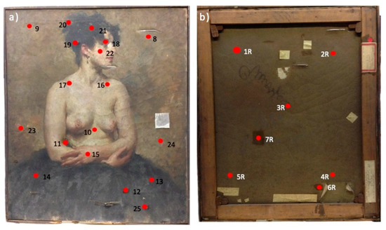 The artwork “Studio di nudo” and position of sampling points from observe (a) and reverse (b) sides of the canvas.