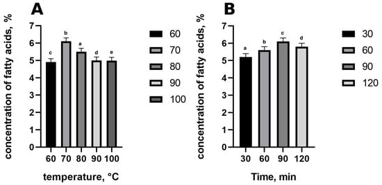 Effect of temperature (A) on derivatization reaction. Effect of time (B) on derivatization reaction; all reactions were performed at 70 °C. Results are expressed as means ± standard error, (n = 6). Values within columns followed by the same lowercase letter (a–d) differed statistically at p < 0.05 (Tukey’s test).