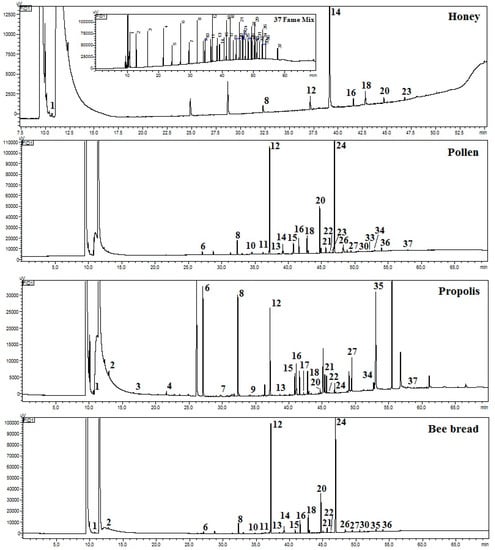Gas chromatography-flame ionization detection (GC-FID) chromatograms of fatty acid methyl ester (FAME) standard and fatty acids derivatives extracted from honey, bee pollen, bee bread, and propolis. The obtained fatty acids derivatives are marked as 1—Methyl butyrate; 2—Meethyl hexanoate; 3—Methyl octanoate; 4—Methyl decanoate; 5—Methyl laurate; 6—Methyl tridecanoate; 7—Methyl myristate; 8—Myristoleic acid methyl ester; 9—Methyl pentadecanoate; 10—Cis-10-pentadecanoic acid methyl ester; 11-Methyl palmitate; 12—Methyl palmitoleate; 13—Methyl heptadecanoate; 14—Cis-10-heptadecanoic acid methyl ester 15—Methyl stearate; 16—Trans-9-elaidic acid methyl ester; 17—Cis-9-oleic acid methyl ester; 18—Methyl linoleate; 20—Methyl arachidate; 21—Gamma-linolenic acid methyl ester; 22—Methyl eicosanoate; 23—Methyl linolenate; 24—Cis-11,14-eicosadienoic acid methyl ester; 26—Methyl behenate; 30—Cis-11,14,17-eicotrienoic acid methyl ester;33—Cis-13,16-docosadienoic acid methyl ester; 34—Methyl lignocerate; 35—Methyl cis-5,8,11,14,17-eicosapentaenoate; 36—Methyl nervonate; 37—Cis-4,7,10,13,16,19-docosahexaenoic acid methyl ester.