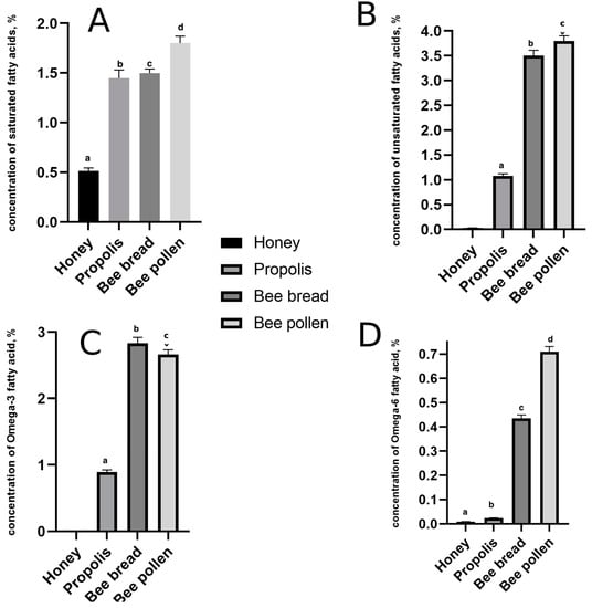 The quantitative amount (expressed in percentage) of fatty acid and composition ((A) Total Saturated Fatty Acid, (B) Total Unsaturated Fatty Acid, (C) Total Omega-3, and (D) Omega-6 Fatty Acid) in propolis, bee bread, bee pollen, and honey, (n = 6). Different letters in each column denote statistical difference at p ≤ 0.05.