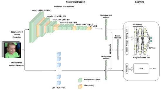 The fusion of deep-learned and hand-crafted features was aimed to provide a holistic description of the images. As mentioned previously, several studies have reported that fusing specific hand-crafted features with images can improve the performance of CNNs [30,32]. For this purpose, the extracted deep-learned features were concatenated with the hand-crafted features, namely LBP, HOG, and PCA, yielding fusion of HOG and deep-learned, fusion of LBP and deep-learned, and a fusion of PCA and deep-learned features. The fused features are then fed to the classification model, as shown in Figure 1.