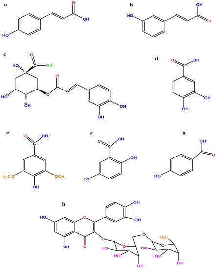 Chemical structure of major phenolic compounds in P. ginseng extract: (a) p-coumaric acid; (b) m-coumaric acid; (c) chlorogenic acid; (d) protocatechuic acid; (e) syringic acid; (f) gentisic acid; (g) p-hydroxybenzoic acid; and (h) rutin.