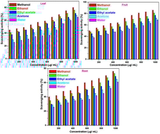 The nitric oxide free radical was scavenged by the plant concentrates to different extents. The reduction of nitrate to nitrite was detected through the measurement of the change in absorbance intensity of “Griess reagent”, a colored azo dye, at 546 nm. Excellent activity was found at 1000 μg/mL in methanolic extract of fruit (93%), followed by leaf (88%) and root (85%), and the effects were dose-dependent. The lowest activity (30%) was found after treatment with 100 μg/mL water extract. The scavenging was recorded as 30–93% for samples against concentrations between 100 and 1000 μg/mL (Figure 2).